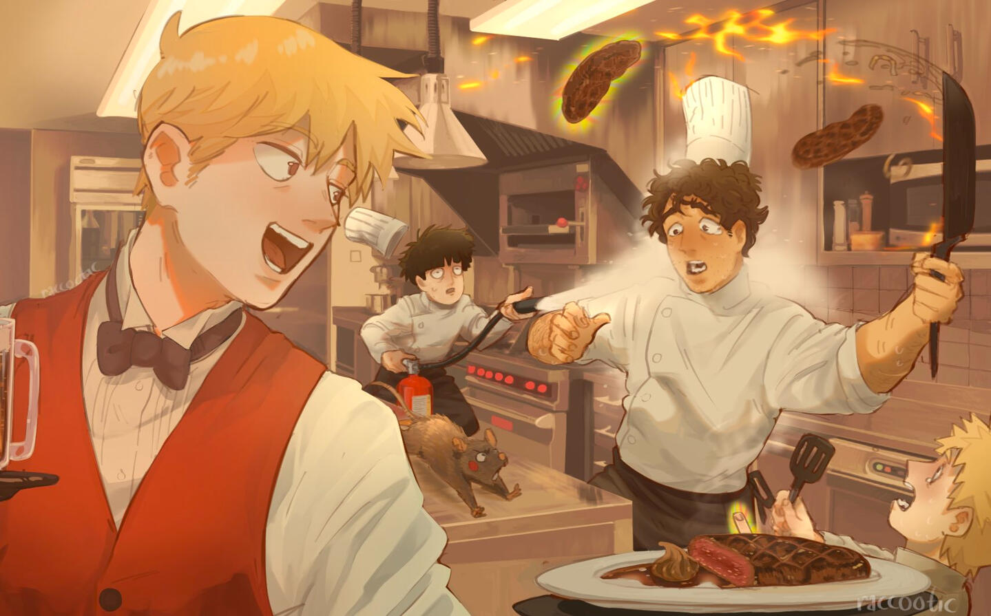 art of mob psycho 100 characters doing random jobsthis time workign at a restaurant